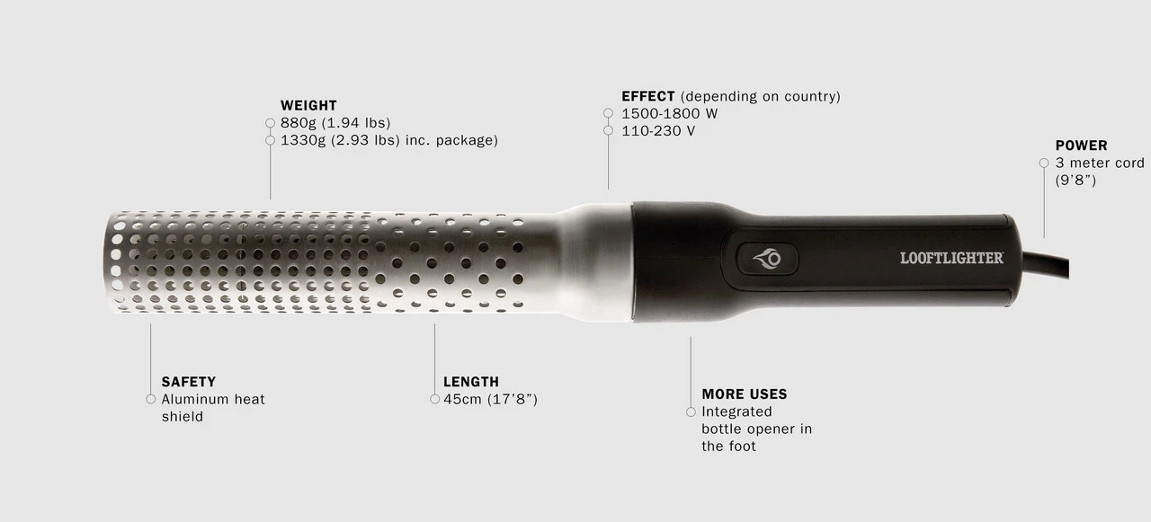 LOOFTLIGHTER, quick, safe, and eco-friendly; no flame, no gas, no lighter fluid.
